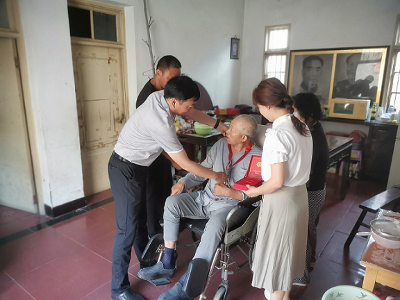 指前村50年党龄的有19人,其中退役军人的党员就有11名。6月23日上午,指前村退役军人服务站站长王国强、指前村党总支副书记虞志琴、指前村退役军人党支部书记蒋伟星来到党员陈旺扣和环锁林家,为他们送上“光荣在党50年”纪念章。退役军人党员陈旺扣前几年因为脑梗瘫痪在床,听到有人来给他送“光荣在党50年”纪念章,挣扎着让家人把他扶到轮椅上,其实他根本就坐不了了,但陈旺扣一直坚持要坐着戴上这个镌刻着无数人青春的荣誉。戴上纪念章的那一刻,陈旺扣的眼睛湿润了,身体不停地颤抖着,见他费力的将不受控制的头低下,静静的看着那枚纪念章许久,用那只也是仅有的那只有点知觉的右手,把装纪念章鲜红的盒子紧紧的拽在手心里不放。在场的人无不被他的“固执”感动,他执着的不是荣誉,而是一名中国共产党员的使命和责任。
