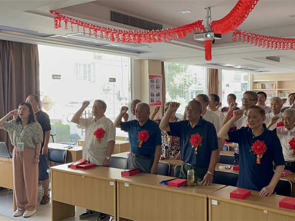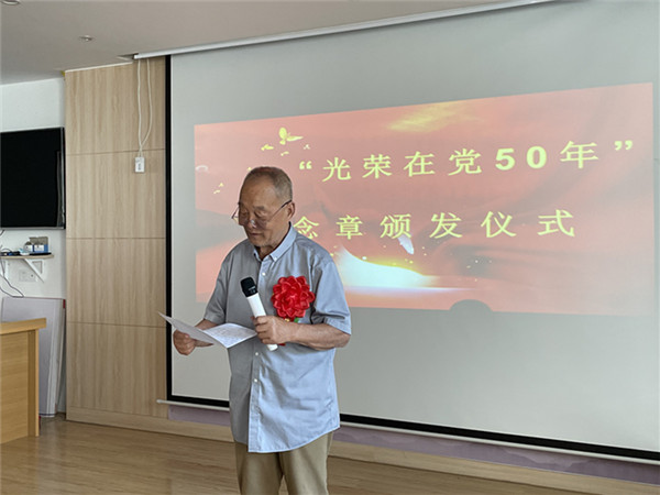 在主题党课结束后,社区特别为党龄50周年以上的老党员们举行了“光荣在党50年”纪念章颁发仪式,庄重简朴的仪式现场,全体起立合唱国歌,随后党总支书记姜黎黎为老党员们颁发了沉甸甸的纪念章,并与老党员们一起重温入党誓词,一字一句,铮铮誓言都体现了老党员们对中国共产党的无限忠诚。之后,王银达同志代表老党员上台发表讲话,他表示,岁月荏苒,从入党宣誓的热血青年到现在年逾古稀的老党员,五十年的党龄,五十载的光荣。老党员们要继承先辈遗志,沿着党指引的道路在新征程中奋勇前行。这一枚小小的纪念章,承载的是荣誉与责任,体现的是党对忠党爱国、矢志奋斗的老党员们的关爱和褒扬。颁发仪式在全场大合唱《没有共产党就没有新中国》的激昂氛围中结束。之后,党总支将继续为行动不便的党员上门发放,切实将这份难得的荣光送到老党员手中。