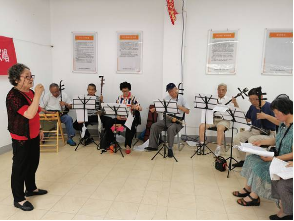 “俏夕阳”戏曲爱好者协会的阿姨们盛装打扮,一首一首尽情地演唱着,旁边伴奏的老同志们一丝不苟地做着“绿叶”,配合默契。观看表演的居民们不时报以热烈的掌声和真诚的赞美。