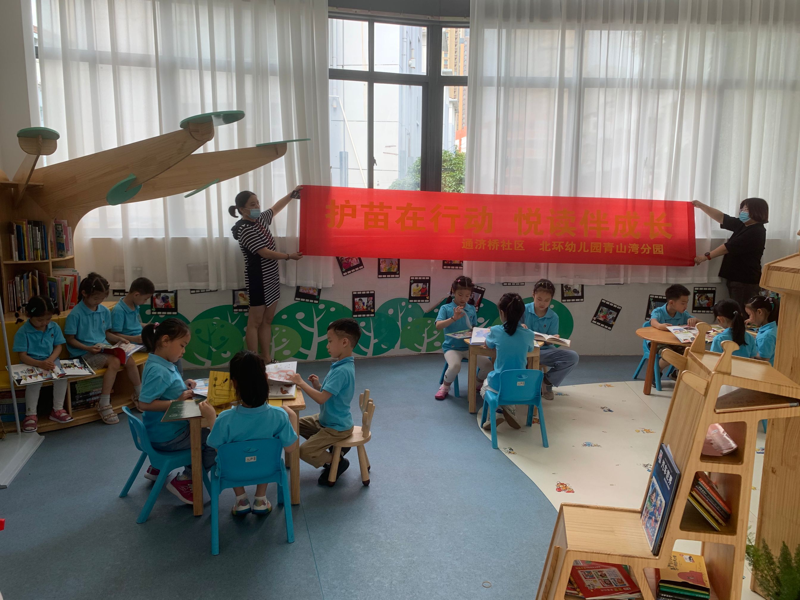 幼儿园是育人的场所,是传播文明的圣地,为了呵护孩子健康成长,净化孩子成长环境,树立健康向上的校园风尚,营造文明和谐的学习、生活环境,通济桥社区与北环幼儿园(青山湾分院)于2021年6月28日联合开展“护苗在行动 悦读伴成长”主题教育活动。