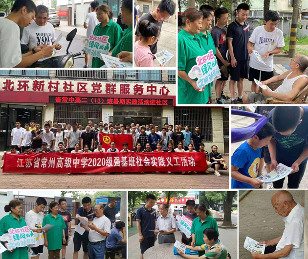 为增强社区居民环保意识、提升文明素养,了解低碳绿色的生活方式,2021年6月30日,江苏省常州高级中学高二(13)班团支部携手北环社区居委会,依托江苏城乡建设职业学院省社区教育特色品牌项目“居民绿色·艺术生活引领”及市社区教育特色品牌项目“生活·艺术·家”,在前期充分准备的基础上,通过宣传画报发放方式,对生活垃圾中可回收垃圾“变废为宝”理念在社区进行了志愿宣传服务活动。