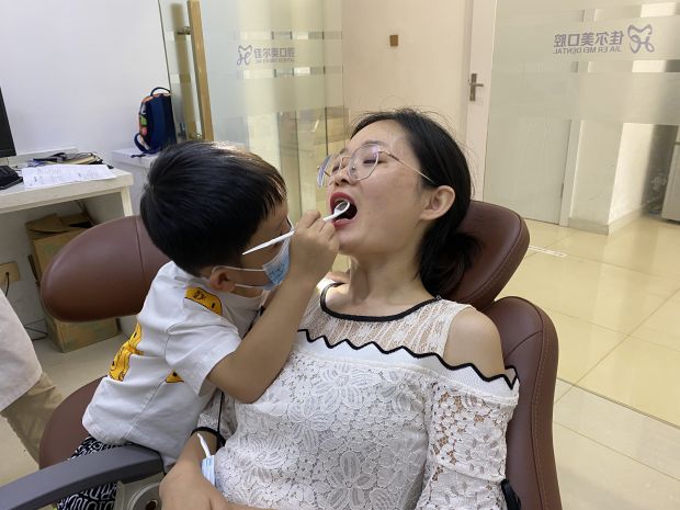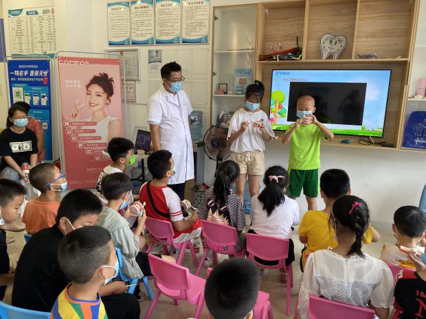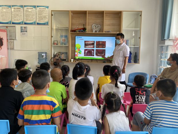 现场,牙科医生张雅俘用PPT的形式向同学们讲授了有关牙齿构造、牙病表现与预防等知识,并通过有奖问答、模型演示、学生示范刷牙告诉同学们如何爱护牙齿、如何正确刷牙。在体验环节,孩子们扮演小医生,和自己的父母进行“医患”角色互换体验,同学们在医生指导下给父母检查口腔,并说出对方牙齿颜色情况,有无坏牙等,最大程度调动了同学们对牙齿保健的兴趣,亲身体验了一次当牙医的感觉。最后,工作人员为同学们颁发“护齿小超人”荣誉证书。