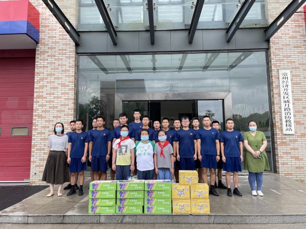 戚大街社区立即和戚月路消防救援站联系,向他们传达了双胞胎的心愿,在征求他们同意后,7月28上午,社区安排人员和物资,带着祖孙三人一同来到消防救援站。队员们正在备战训练,龙凤胎向消防队员敬队礼,送上物资,向他们表达由衷的敬意。