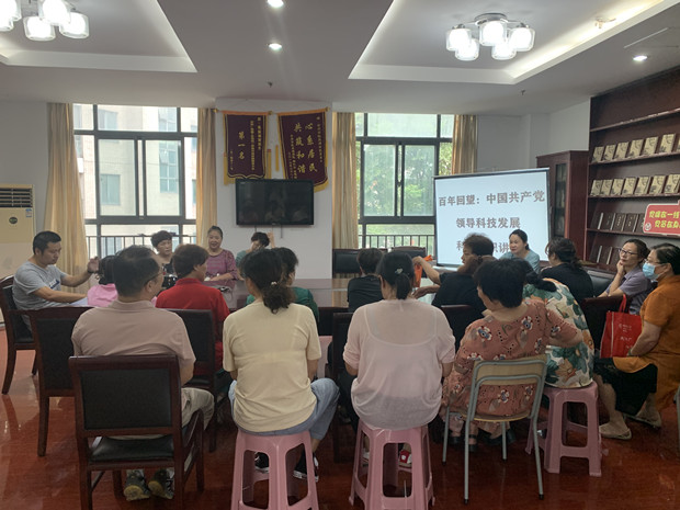 志愿者讲师带领居民一起回顾了党的建立到建国前的重大历史事件,重点讲述了建国后中国共产党领导全国人民从无到有,成功创造一个又一个中国科技发展史上的奇迹,向居民们展示了建国后一代又一代科技工作者在中国共产党的正确领导下取得的成绩,中国科技实力伴随着经济发展同步壮大,实现了历史性的跨越。