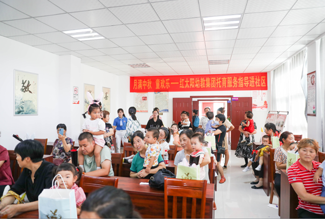 活动中,老师首先对前来参加的居民讲解婴幼儿注意事项,主要针对0-3岁孩子的父母,辅导婴幼儿家长以科学的方法开发宝宝早期潜能、培养生活习惯,传播先进教育理念,针对育儿过程中遇到的疑惑,家长们积极与老师沟通,共同探讨科学的育儿方法。老师们还针对不同月龄段的家长进行指导,如何通过亲子互动塑造幼儿健康开朗的性格,锻炼幼儿社交及表现能力,体验亲子合作游戏的乐趣。最后,大家一起动手做月饼,体验不一样的“中秋味道”。
