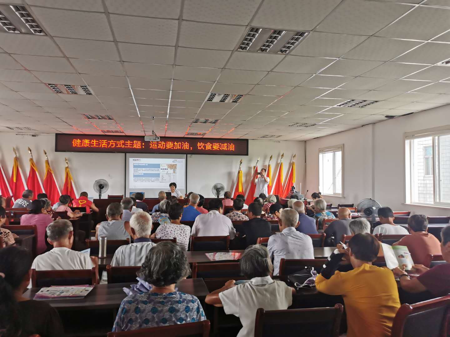为倡导和传播健康生活理念,普及健康知识,提高群众健康水平,改变不良生活习惯,远离慢性病的困扰,9月19日,指前镇社区教育中心在指前镇清水渎村居民学校举办了“健康要加油 饮食要减油”健康知识讲座。来自村老年协会的近60位老年人聆听了讲座。