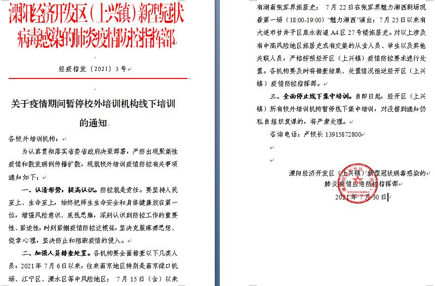 今年上半年,随着全球疫情形势变化,新冠病毒变异毒株传播力增强,5月中旬以来,国内多地先后发生聚集性疫情,特别是发生南京禄口机场、张家界景区等的聚集性疫情已扩散到国内多个省份,为了进一步加强校外培训机构做好疫情防控和安全治理常规工作,溧阳经开区(上兴镇)新冠疫情防控指挥部采取有效策略,积极应对,由上兴镇社区教育中心牵头,派出所、消防、安监、市监分局、城管、医院等多部门联合执法,多次对辖区内校外培训机构进行定期或不定期指导和督查,确保教育一方平安。