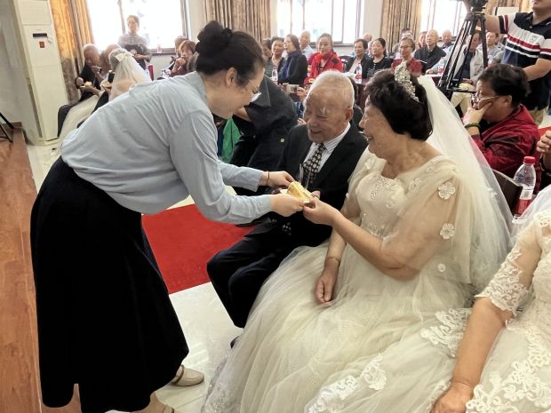在“婚礼”仪式环节,在主持人和现场工作人员的引导下,一对对“老新人”换戒指、发喜糖、切蛋糕,大家仿佛回到了当年新婚时光。有老兵们表示,当年结婚很简单,也没有举行什么仪式,结完婚就立即回到了单位工作。今天的活动,让他们感受到了大家的关心,这是一个快乐、惊喜而又有意义的金婚纪念。很多老人留下了开心的眼泪,激动的笑容。