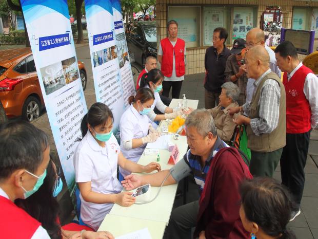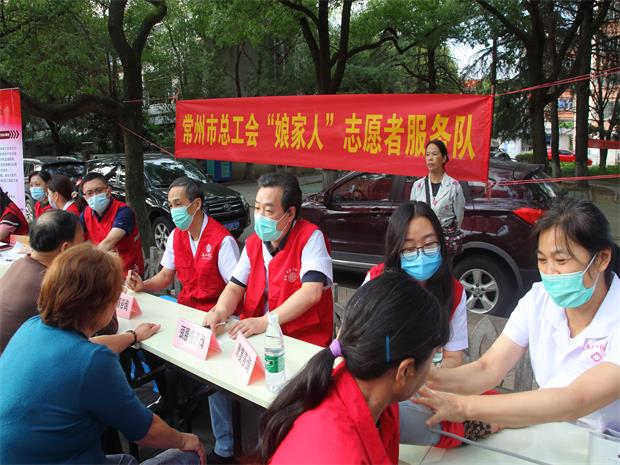 文艺活动开场前,常州市总工会的“娘家人志愿服务队”在红梅社区广场上开展了志愿服务活动,为小区内的居民免费测量血压、血糖等义诊活动并咨询工会相关政策及服务内容,热情细致的服务体现了工会是职工贴心的娘家人。
