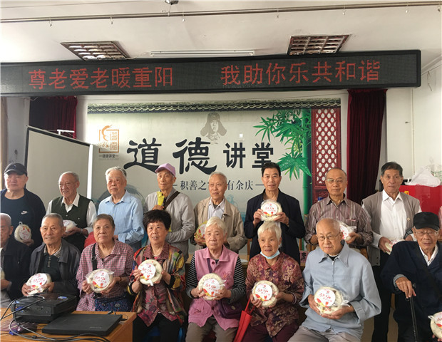 此次道德讲堂共分为“唱歌曲、学模范、诵经典、谈感悟、送吉祥”五个环节。活动在全体齐唱《公民道德歌》的动人歌声中拉开序幕。大家一起聆听网格员韩春萍对尊老这一传统美德的感悟:尊老爱幼历来是我们中华民族的传统美德。中华民族之所以血浓于水,之所以历经沧桑,生生不息,之所以“人情味”非常浓厚,尊老敬老是一个很重要的原因。之后又切合自身多年的基层工作,向大家讲述了多位网格员敬老孝亲的故事。听完身边好人故事后,大家畅谈了内心的感受。 “老来受尊敬,是人类精神最美好的一种特权,帮助天下的老人是我们每一个人都该做的。”王荷英女士这一说道。诵读了一段《孟子》的名言:“老吾老,以及人之老;幼吾幼,以及人之幼。”,让大家深刻理解从古至今孝老爱亲传统美德的重要意义。在送吉祥环节,社工为参加活动的每个人发了一份重阳糕,希望大家都能在此次道德讲堂中有所得、有所获,希望大家都能从自己做起,以身作则,身体力行,尊老爱幼,孝老爱亲,感悟道德,从而践行道德,做一个文明守礼的人。