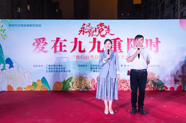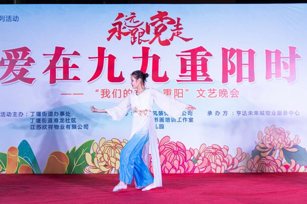 “一年一度秋风爽,岁岁年年又重阳”。金秋十月,丹桂飘香,为迎接传统节日重阳节的到来,弘扬中华民族传统美德,营造尊老、敬老、爱老、助老的浓厚氛围,进一步倡导文明、和谐、互助、友爱的良好风尚,2021年10月13日晚,由丁堰街道办事处、丁堰街道港龙社区居民学校、江苏欣祥物业有限公司主办,江苏浩风装饰有限公司、集贤居书画培训工作室、丁堰幼儿园协办的“永远跟党走,爱在九九重阳时”为主题的“我们的节日·重阳”文艺演出活动为老年居民群众送上了丰盛的文艺大餐。丰富多彩的节目表演,让老年人体会到了“老有所乐”的快乐,满脸洋溢着幸福、满足的笑容。丁堰街道党工委宣统委员符敏霞、港龙社区副主任顾鑫、欣祥物业公司董事长钱伟文等领导一起观看了演出。