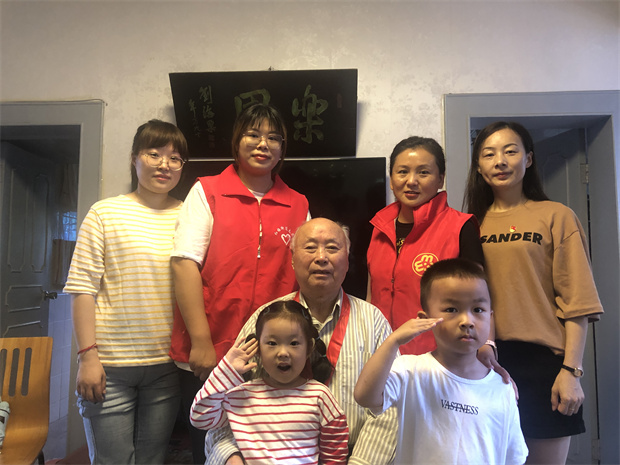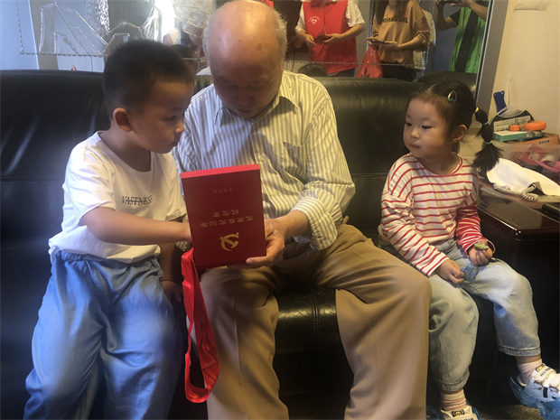 在社区工作人员的陪同下,社区支部书记与幼儿园的党员老师带领小朋友一起来到有着60多年党龄的刘松山爷爷家,给他送上一块香喷喷的重阳糕,祝愿他:身体健康,平安幸福!刘松山爷爷在我们浓浓的关怀下,拿出了自己珍藏的“光荣在党50年”的纪念章与我们共同分享。小朋友也拿出自己所画的作品,和刘松山爷爷一起交流。