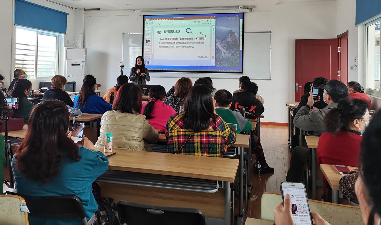 为让参训人员充分认识“互联网 社区教育”的优势,培训特邀常州老年大学薛二伟副校长作《老年大学线上教学实践与思考》的专题讲座。薛校长从线上教学的优势与便捷切入,结合常州市老年大学多年来线上教学的实践经验,给出了适宜的教学设计路径,提出了相应的建设方案,并引导教师结合教学实际灵活设计多维度的教学模式。培训中,常州老年大学远程教育管理服务中心黄晓茹副主任现场讲解了利用微信、企业微信开展直播教学的具体操作方法,并耐心解答师生的问题。现场气氛热烈,师生学习兴趣浓厚。