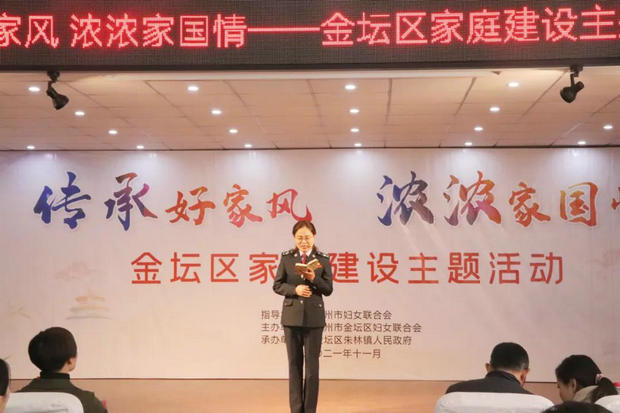活动在歌曲《家和万事兴》的甜美歌声中拉开了帷幕。市妇联对最美家庭工作室进行揭牌,并对江苏省最美家庭进行表彰。随后全国最美家庭代表杜秀玲走上舞台向大家讲述她与妈妈的家庭故事,引起现场热烈的掌声。下一个环节,金坛区妇联为“好家风好家训”宣讲志愿服务队成员颁发聘书,宣讲员郝梦莹巾帼不让须眉,现场朗读经典红色家书,热情展现巾帼风采。“好家风好家训”小小宣讲员史雨欣“我的家风故事”宣讲更是把场上观众的热情推向高潮。