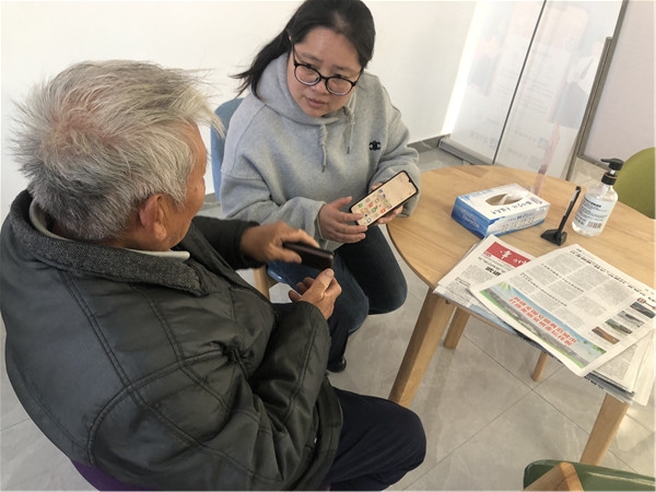11月26日,直溪镇直溪社区便民服务大厅内洋溢着欢声笑语。社区志愿者为前来读书看报的老年群众讲解如何使用智能手机。