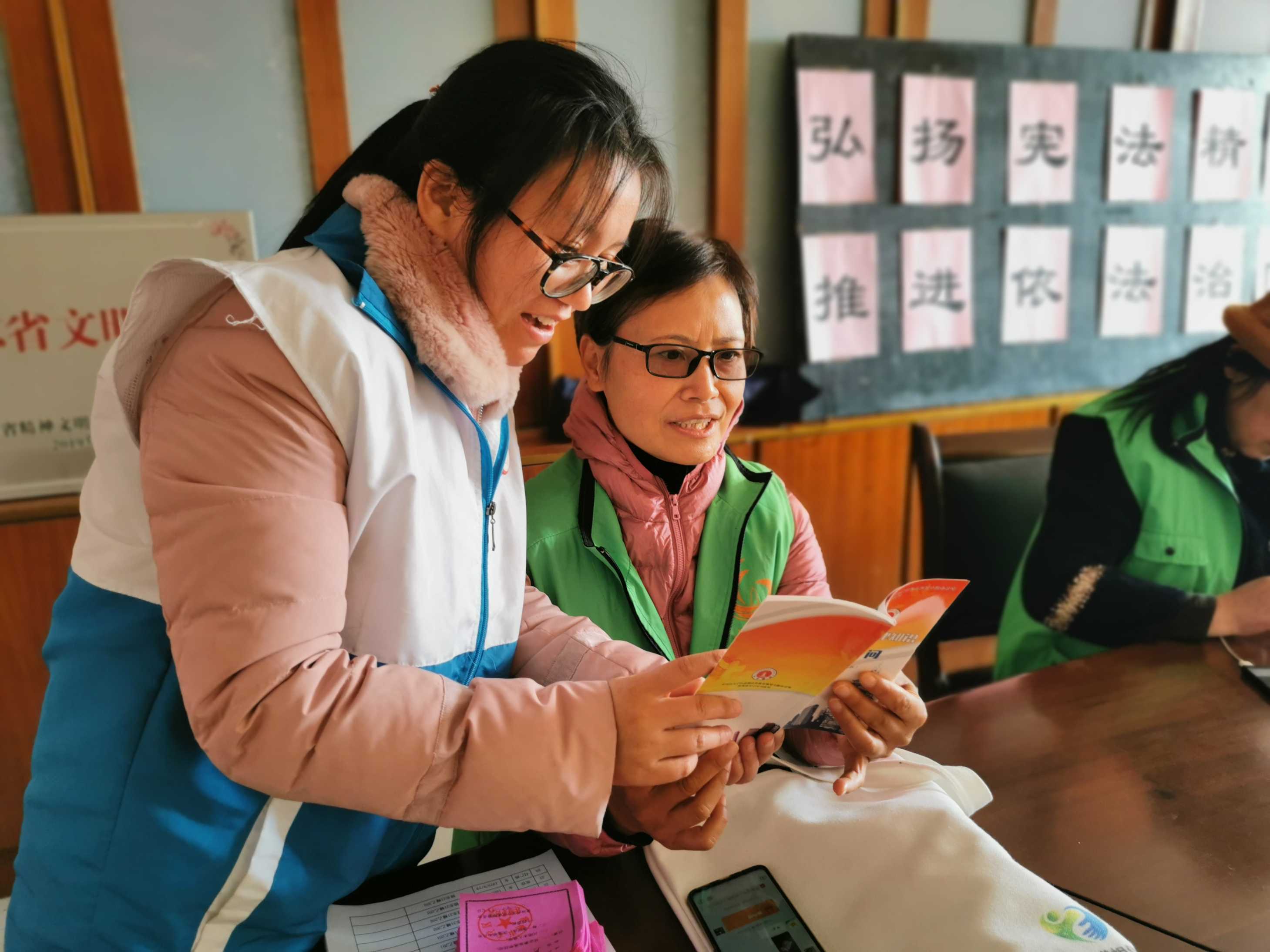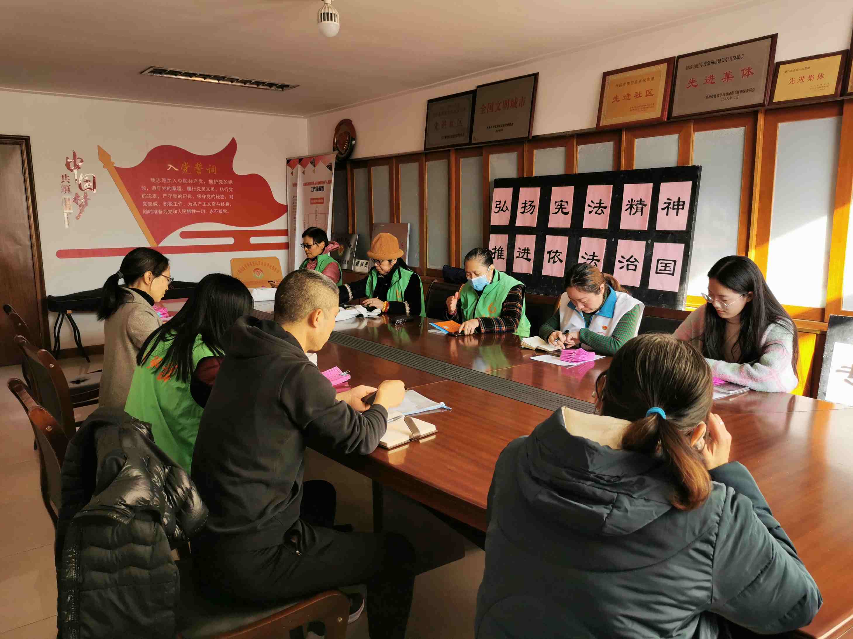 在宪法学习日活动中,锦绣东苑社区8位网格员,他们还是法律明白人带头学习宪法知识,学习宪法章程。社区工作人员为他们发放宪法宣传手册、《常用法律知识100问》等宣传手册,为他们普及宣发知识,加强自身法律维权意识。
