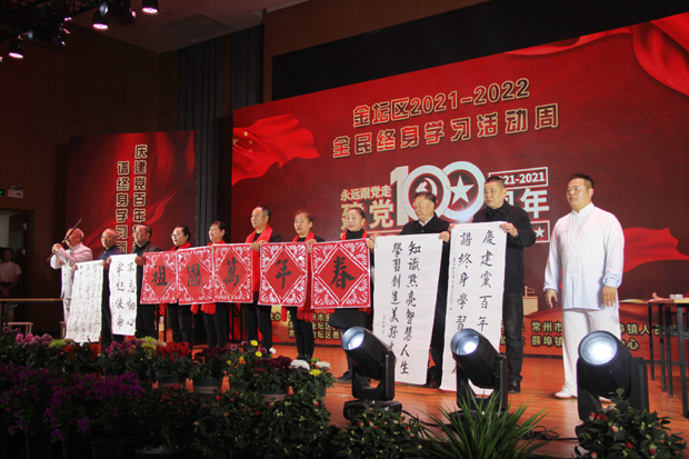近日“庆建党百年华诞,谱终身学习新篇”2021—2022年度金坛区全民终身学习活动周启动仪式暨表彰会在薛埠镇薛埠村委隆重举行。区政府新闻办副主任王珊宣布活动开幕,区教育局副局长张五芳宣读表彰决定,薛埠镇副镇长袁国栋致开幕辞,各街镇政府分管领导以及受表彰的市民代表参加了活动。