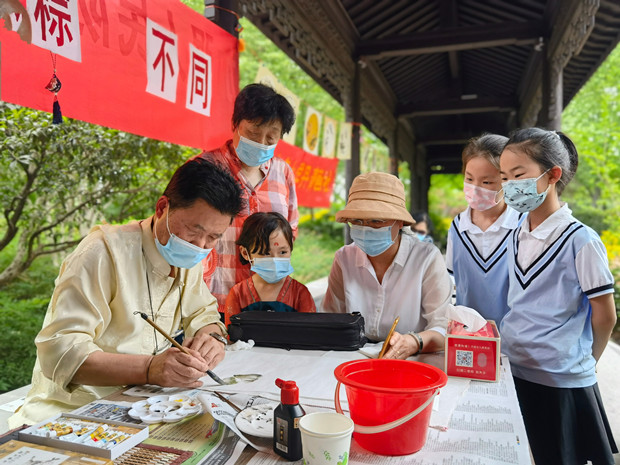 为营造古色古香的氛围感,社区将活动地点设在古运河畔同济桥段绿地廊亭,社区居民王留云等书画爱好者现场吟诗作画、挥毫泼墨,一幅幅应景书画、抗疫主题、红色系列作品悬挂长廊两侧,香囊、蛋袋传统装饰点缀其间,表达着人们对美好生活的期待。放学归来的孩子们将“六 一”的欢乐与对端午的祝福寄情于一首首经典曲目,充满国风古韵的《战台风》气势磅礴,优美抒情,网红曲《你笑起来真好看》弹出了不一样的风格与韵味。活动现场居民们笔歌墨舞、丹青颂党、余音绕梁、祝福不断。