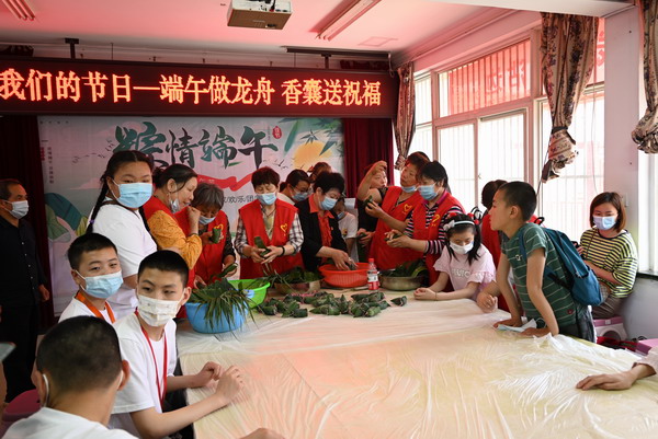 端午节传统习俗。随后社区志愿者们将提前准备好的粽叶、糯米等材料摆放好,开始手把手教导孩子们包粽子。大家先捋平粽叶,做成漏斗状,填进糯米并压实,最后封口捆扎,孩子们学的一板一眼,在志愿者的指导下慢慢掌握了技巧,不一会功夫,各式各样的粽子就在他们的指尖诞生了。