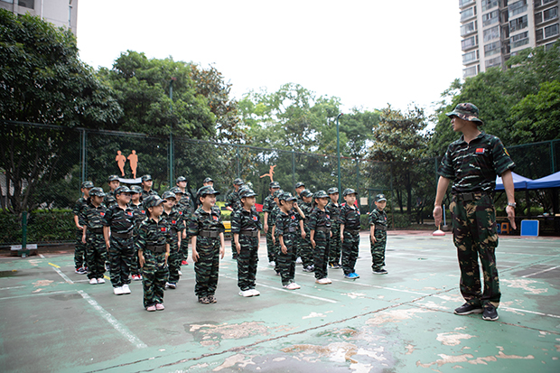活动中,孩子们身着迷彩服,在教官的指导下进行一系列的军姿队列训练,现场军事训练氛围浓郁,大家聚精会神地听从教官口号,做出标准动作;随后吴教官给孩子们讲解了止血、包扎、固定等急救理论知识,孩子们在演练中学习头部外伤三角巾包扎法、手背外伤绷带“8”字包扎法等急救包扎法;最后,吴教官给孩子们示范了标准的叠“军被”方法,孩子们听的十分入神,一边仔细地听讲解,一边动起了双手跃跃欲试,有模有样地学着对折、合拢被子。每个实践操作环节,吴教官都手把手纠正孩子们的操作细节,并对最终演练成果进行了点评。