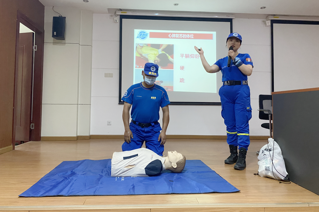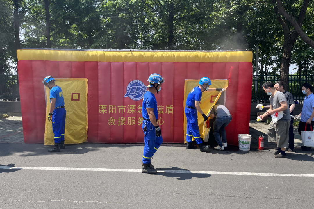 本次演练培训分为室内培训、室外演练两个部分。在会议室内,城北消防中队队员教学灭火器的使用,溧阳市蓝天救援队队员教学心肺复苏等急救技能。随后全体参训人员分成4个小组,依次至4个室外区域宣传教育区、灭火器操作区、烟雾逃生体验区、急救技能实操区观看宣传展板和开展急救技能演练。