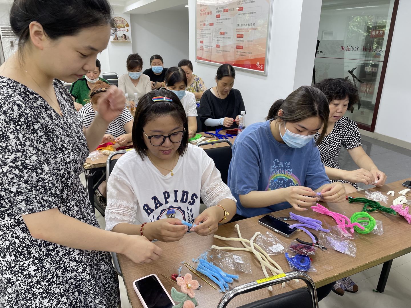 进行了简单介绍后,老师开始给居民们发放制作绒花的绒棒,教大家如何用绒棒制作成一个绒花,今天教大家做的花分为三层,老师教大家开始制作花瓣,从内层开始,需要用手拧紧,把花瓣弄出花瓣尖,大家做得都非常认真,老师也非常耐心得一一指导,大家都非常认真的制作,经过大家的努力绒花终于初见雏形,阿姨们都特别得开心,秦阿姨开心得说:“我手笨,本来就是来参加活动玩玩,结果没想到还能做出跟电视剧里一样的绒花,真好啊!”