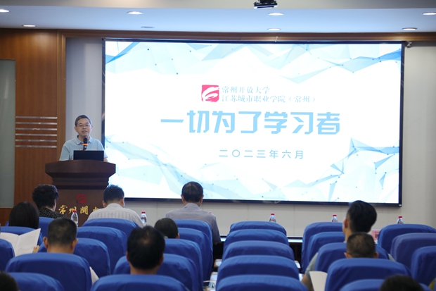 常州开放大学党委书记、校长顾锡宏致辞,他作了“一切为了学习者”的主题报告,提出常州开放大学是以现代信息技术为支撑,面向全体社会成员,举办高等学历继续教育、非学历继续教育和高等职业教育,服务于常州终身教育体系构建和学习型城市建设的新型大学;他强调,推进社区教育、服务全民学习是常州开放大学的职责与使命。