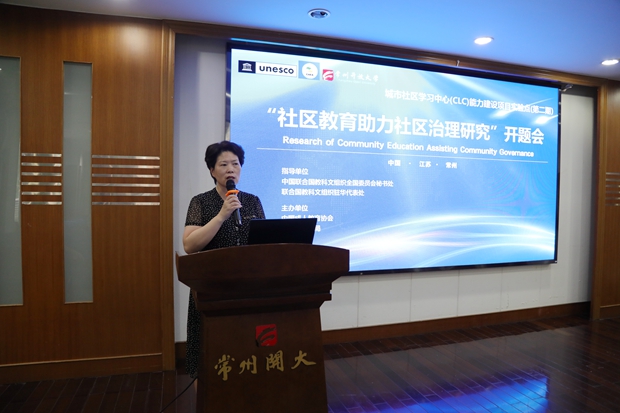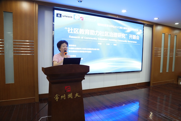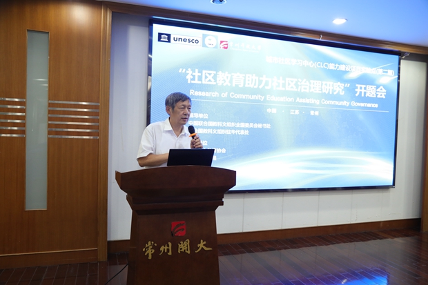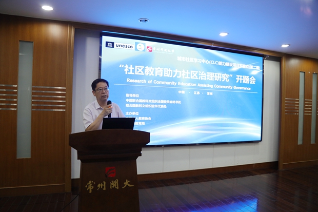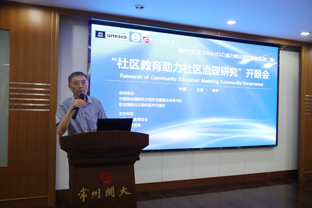 6月30日,联合国教科文组织城市社区学习中心(CLC)能力建设项目第二期子项目“社区教育助力社区治理研究”开题会在常州开放大学举行。中国成人教育协会副会长、城市社区学习中心CLC总项目组组长包华影、中国成人教育协会学术委员会委员、城市社区学习中心CLC总项目组副组长周延军、江苏省成人教育协会会长、城市社区学习中心CLC专家组组长孙曙平、江苏省成人教育协会专家委员会专家、城市社区学习中心CLC总项目组秘书长蒋根兴、常州市教育局终身教育与民办教育处处长丁皓、常州市民政局基层政权和社区治理处处长王江华、南京市建邺区社区培训学院副院长章学军等莅临指导。常州开放大学党委书记、校长顾锡宏、常州开放大学副校长王中以及51位“社区教育助力社区治理”子项目负责人参加了会议。