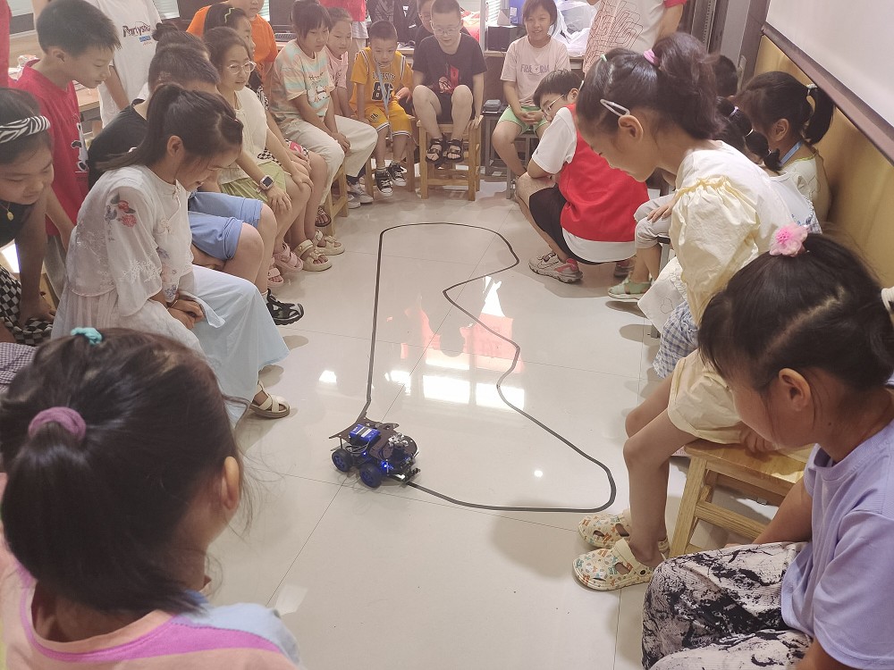 活动前,老师带领孩子们进行破冰游戏,孩子们积极参与,热情高涨。活动中,老师用通俗易懂、活泼生动的语言,向孩子们讲述了电子信息科技的重要性,以及它在现代生活中的广泛应用,同时向小朋友们展示了智能小车和流水灯魔方阵列,孩子们听得津津有味。看到智能小车在黑色胶带轨道上灵活地穿行时,孩子们不禁发出了惊叹声。为了让孩子们更好地参与,在志愿者老师的指导下,孩子们分组进行DIY,制作出了可独立行驶的电子小车等。他们兴奋地展示着自己的作品,脸上洋溢着自豪和喜悦。
