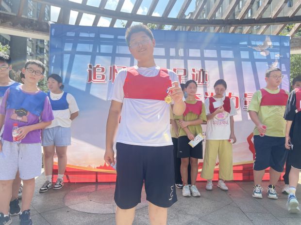 五四精神,勇夺“党旗”。五四运动狂飙般的呐喊声早已散去,五四运动精神却一直沉浸在中华民族奋斗的血脉里。孩子们分为红蓝两队PK,工作人员提前在观墩花苑核心区域隐藏分布了三个任务点,两队队员相互追逐,奔跑着、呐喊着,如一个个小战士般在“枪林弹雨”中冲锋陷阵,躲避重重“抓捕”,用自己的智慧和勇气冲破障碍寻找任务点,完成党史知识任务得到卡片线索,夺回全部十张“党旗”旗帜卡片获得最终的胜利,卡片上印章最多者也荣获了一枚精致的“勇士勋章”。我们回望那段历史,重温那段激情燃烧的岁月,循着先辈们的足迹赓续穿越世纪的无畏与勇毅。