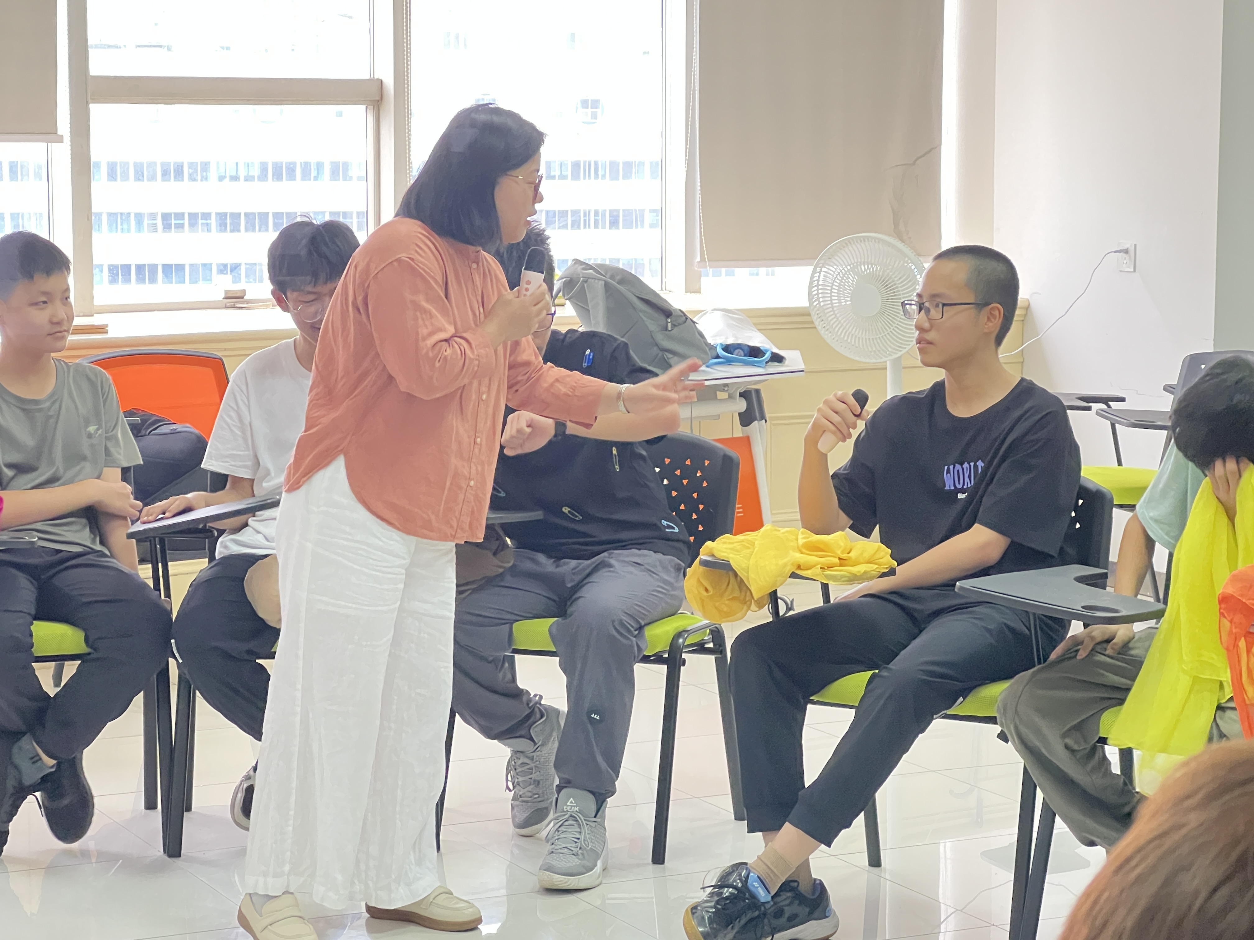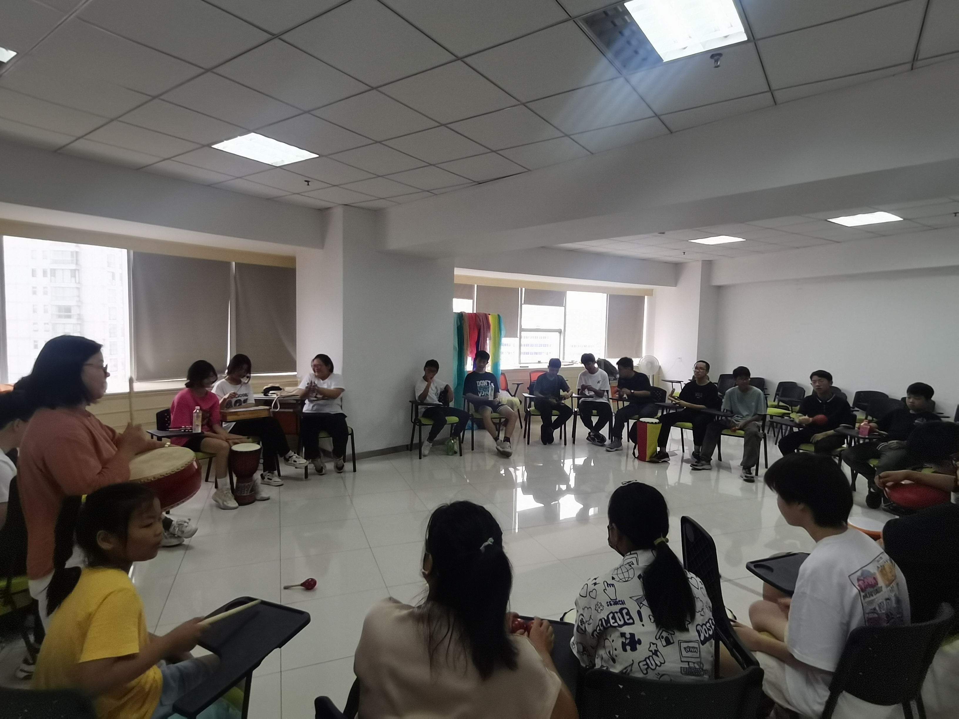 本次活动由新田家庭健康中心唐红叶老师带领,唐老师首先根据孩子们参加活动的次数给孩子们分成了四组,经过了之前3次团辅活动,唐老师让大家回顾了自己参与活动的前后感受,孩子们有的喜欢沙盘,有的喜欢绘画,有的同学对前一次的自我探索记忆犹新。而后唐老师让同学们选择一条自己喜欢的颜色的丝巾。选择过后,唐老师让同学们思考自己为什么选择了这条丝巾,这条丝巾的颜色让自己想到了什么?唐老师通过击鼓传花的方式让不同的孩子去说出自己对于颜色与心情的联想。最后来到本次活动的重头戏,唐老师让孩子们选择自己喜欢的乐器来进行演奏,孩子们拿到乐器之后都纷纷开始敲打起来,教室显得比较吵闹。在吵闹声中,孩子们渐渐注意到唐老师在用一种节奏敲击自己面前的鼓,有的孩子开始随着唐老师的节奏跟着敲打,原本吵闹的房间开始变得有秩序起来,再到慢慢地融入旋律,逐渐更多的同学开始随着唐老师的节奏开始敲打,直到一起完成了一场有节奏的音乐。孩子们发自内心地笑,如碧波般在每个人的脸上温柔地荡漾开来音乐逐渐唤醒了体内那颗被压力遮住眼睛的心,在舒缓的音乐声中,在唐老师轻柔的引导声里,放松身体的每一处,仿佛置身于云彩中,阳光洒在身上,浑身都暖暖的。
