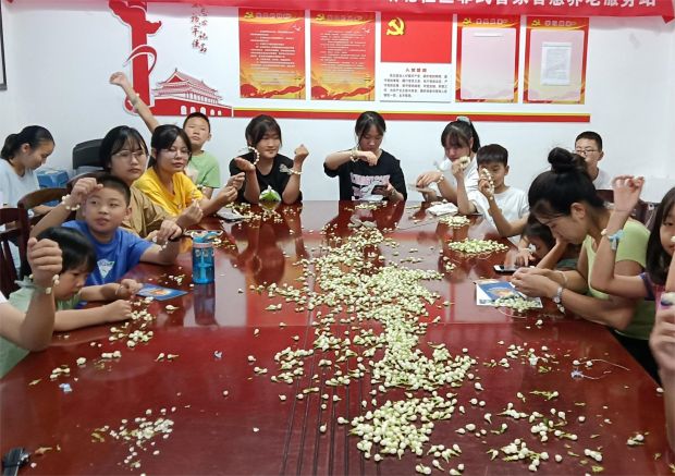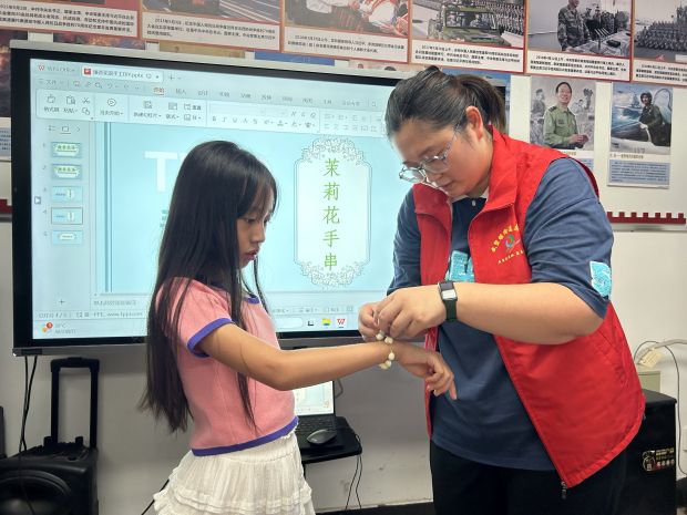 宣讲后,就是茉莉花手串DIY环节,社区志愿者借用了七夕斗巧之一的以针穿藕的形式,取其制法精巧,窜出了茉莉花手串。社区志愿者向大家分发了制作材料,一边讲解一边示范了制作过程。在志愿者的指导下,大家纷纷动起手来,轻声交流,相互帮助,现场十分热闹。制作完成后,大家看着自己的作品,脸上都露出了灿烂的笑容。盛夏晴空,茉莉花的香气沁人心脾。