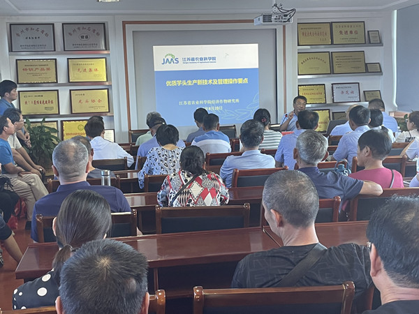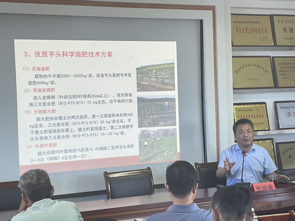 本次培训会,特别邀到江苏省农业科学院药食同源作物创新团队首席专家、博士、研究员张培通为广大种植户作题为《优质芋头生产新技术和管理操作要点》讲座,张研究员从优质芋头脱毒快繁技术、优质芋头科学施肥技术、优质芋头绿色防控技术、优质芋头全生物降解黑地膜覆盖技术、优质芋头大棚高效种植技术、优质芋头当前管理要点六个方面向芋农们做了详尽细致地讲解。张研究员重点从防止田间涝渍灾害、保持适宜水分、防苗早衰、壅土除边荷、施第二次膨大肥等五个方面做好优质芋头的当前管理工作。培训结束,张研究员和芋农们就红香芋种植进行了现场交流。交流结束在“健倡”红香芋种植教育服务“三农”基地负责人的带领下参观了科技大棚和红香芋种植示范基地,进一步交流和探讨红香芋种植最优模式和施肥、治虫、田间管理等方面的关键技术。