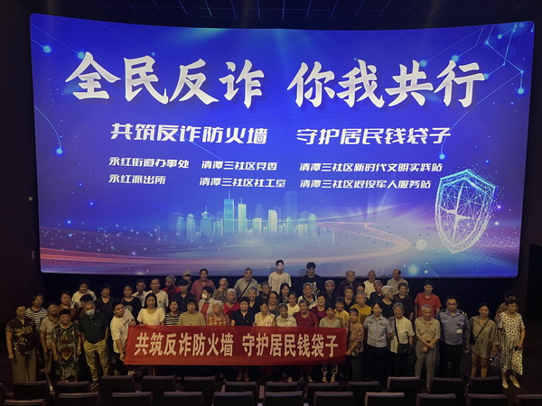 为进一步筑牢辖区居民群众防范电信网络诈骗的安全防火墙,切实守护好居民群众的“钱袋子”,8月25日下午,清潭三社区党委联合永红街道办事处、永红派出所、清潭三社区新时代文明实践站、清潭三社区退役军人服务站和清潭三社区社工室开展反诈宣传活动,邀请社区党员、居民代表、网格员等100余人走进影院,共同观看反诈电影《孤注一掷》。
