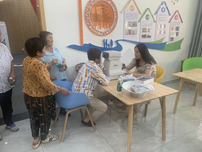 首先,由高级验光师潘老师介绍爱眼护眼常识,随着年龄的增长,老花眼病和干眼症等会多发,了解发病原因及应对的办法。同时,由于电脑和手机的普及,老年人用眼过多,增加了病变的风险。提醒大家要增加户外运动,控制使用电子产品的时间,多吃富含维生素A、胡萝卜素、叶黄素的食物,合理进行保健护理。其次,组织给老年朋友进行免费验光,及时了解自己的老花眼或者近视度数。还对存在眼睛疾病的老人建议去医院进一步检查、治疗。