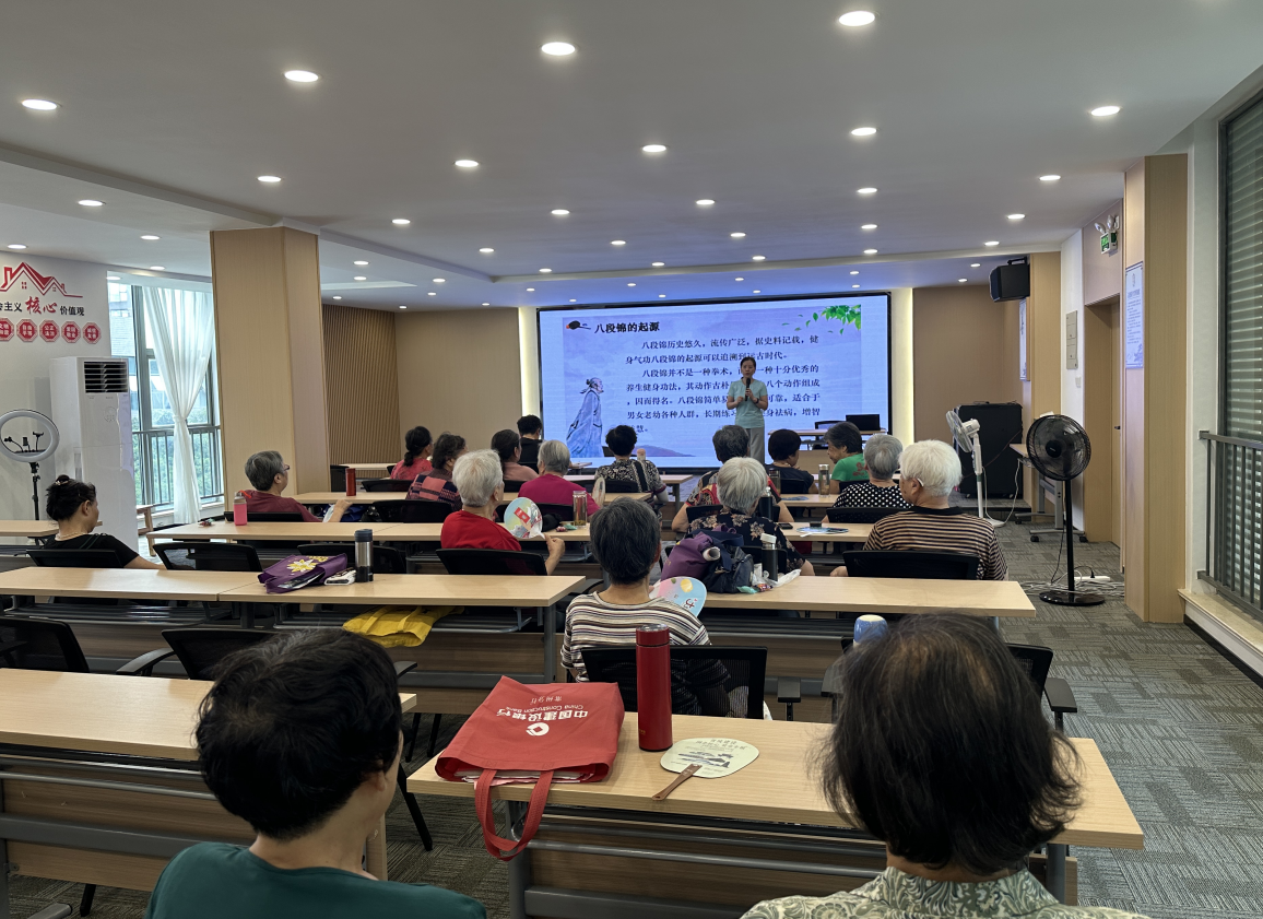 为了让居民们进一步理解八段锦养生健身的作用,老师一边教授着八段锦预备式口诀“意守丹田,宁静心神,调整呼吸,端正身型……”,一边示范“八段锦”的基本动作要领。大家跟随练习,表现出极大的热情和兴趣,现场一片欢声笑语。通过理论学习和动作分解,大家的锻炼效果明显提高。居民们对八段锦很多知识和动作的理解有了进一步的加深。