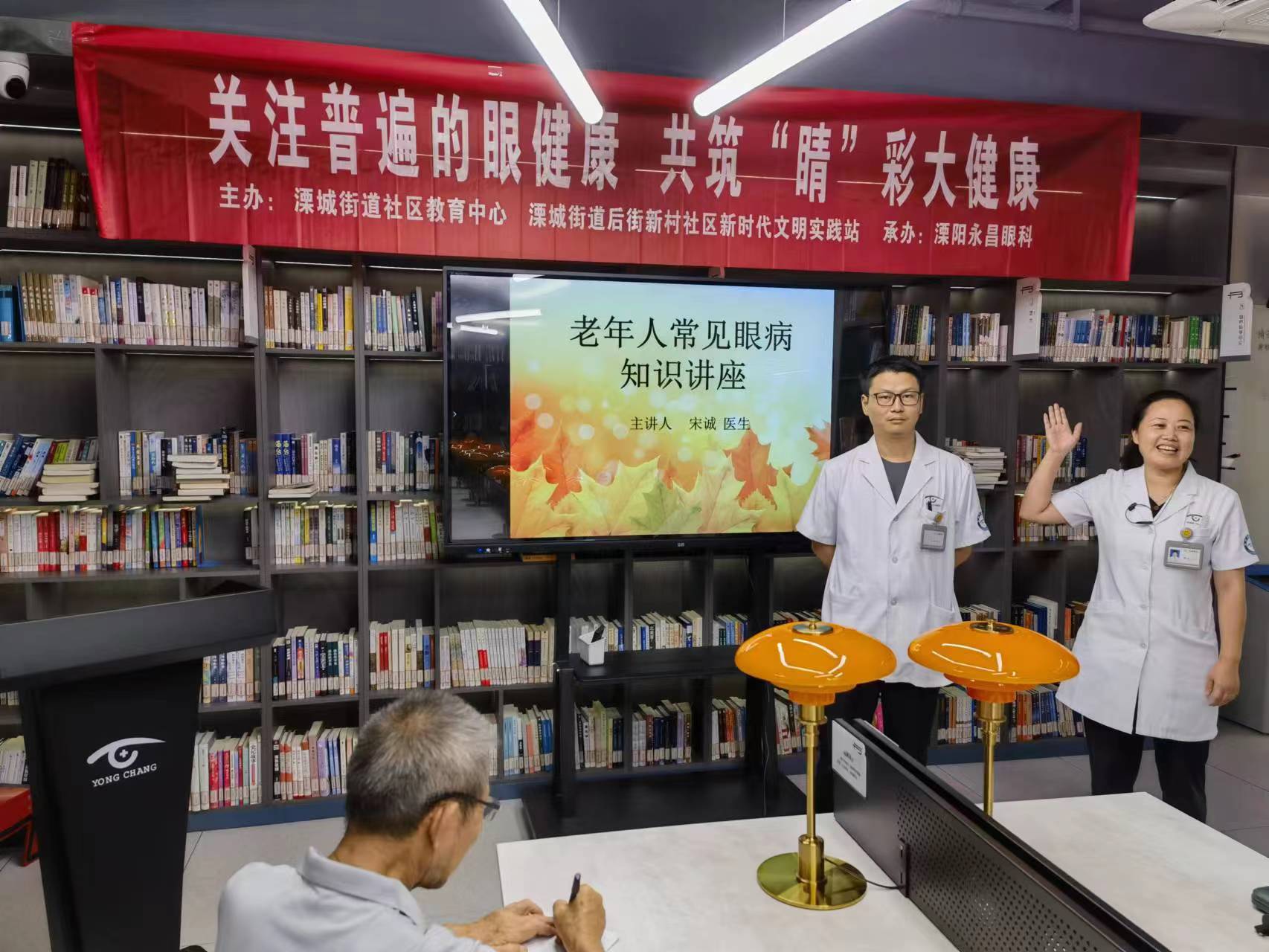 溧阳永昌眼科郑芸主任作动员致辞。眼科宋诚主任作了《老年人常见眼病》专题科普讲座,宋主任运用PPT直观介绍干眼症、飞蚊症、老花眼、白内障、青光眼的症状、病因及预防和治疗。同时强调由于电脑和手机的普及,增加了病变的风险。提醒老年朋友要适当增加运动,控制使用手机等电子产品的时间,平时多吃富含维生素A、胡萝卜素、叶黄素等利眼食物,开展合理护眼。其次,永昌眼科组织给老年朋友进行免费清洗眼部、调整眼镜、清洗眼镜、视力检查、裂隙灯眼表检查、白内障检查、干眼螨虫检查,一经检查出有干眼、螨虫老年朋友,永昌眼科免费送5次的治疗。