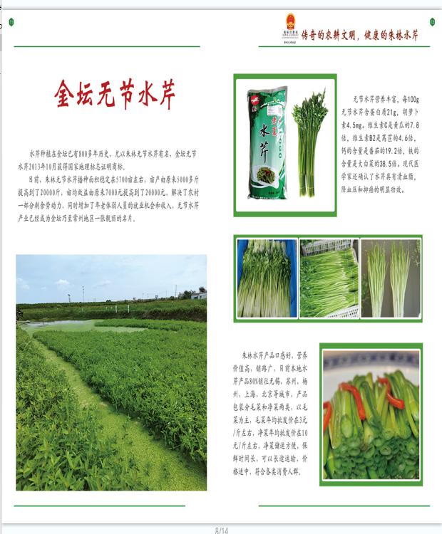 为切实提升朱林无节水芹的品牌美誉度、知名度,朱林镇委托区农业农村局在高铁上海站和南京南站利用电子屏等宣传媒介进行为期1个月的品牌集中宣传。此外,镇农村工作局制作朱林水芹品牌宣传手册在金坛农民丰收节等重要节日期间进行发放,累计共发放宣传册1500余份。