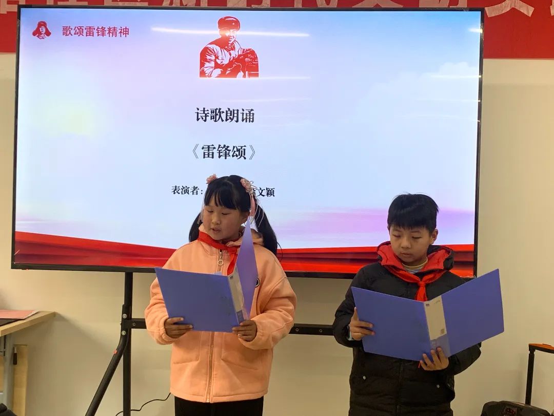 小朋友们被雷锋无私奉献和全心全意为人民服务的精神深深感动。活动现场,来自尧塘小学的周佳琦、段文颖两位同学以饱满的激情、细腻的情感,伴随着舒缓的背景音乐,深情朗诵了《雷锋颂》,用诗歌表达了对雷锋同志以及先烈们的敬仰之情。