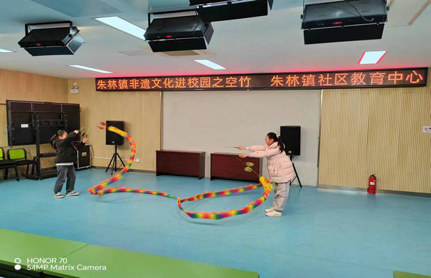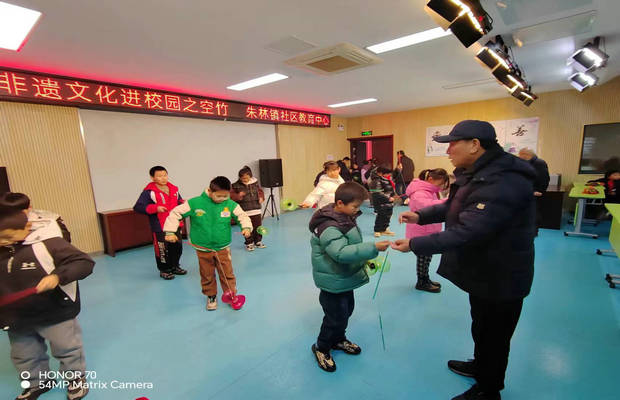 3月5日下午,朱林镇中心小学抖空竹学生社团的全体学员在金坛区空竹协会春风分会的滕庆华老师指导下举行了“非遗文化(空竹)进校园”活动。本次活动由朱林镇社区教育中心主办,活动展示了单人、双人和多人表演,其中最有特色的是空竹龙舞,精彩的表演赢得了大家的阵阵掌声。空竹作为该校特色项目,深受广大师生的喜爱,学校通过开展抖空竹活动,让师生及家长了解空竹、热爱空竹,增强体质的同时,体验到激情与快乐,传承优秀的民族文化和精神。