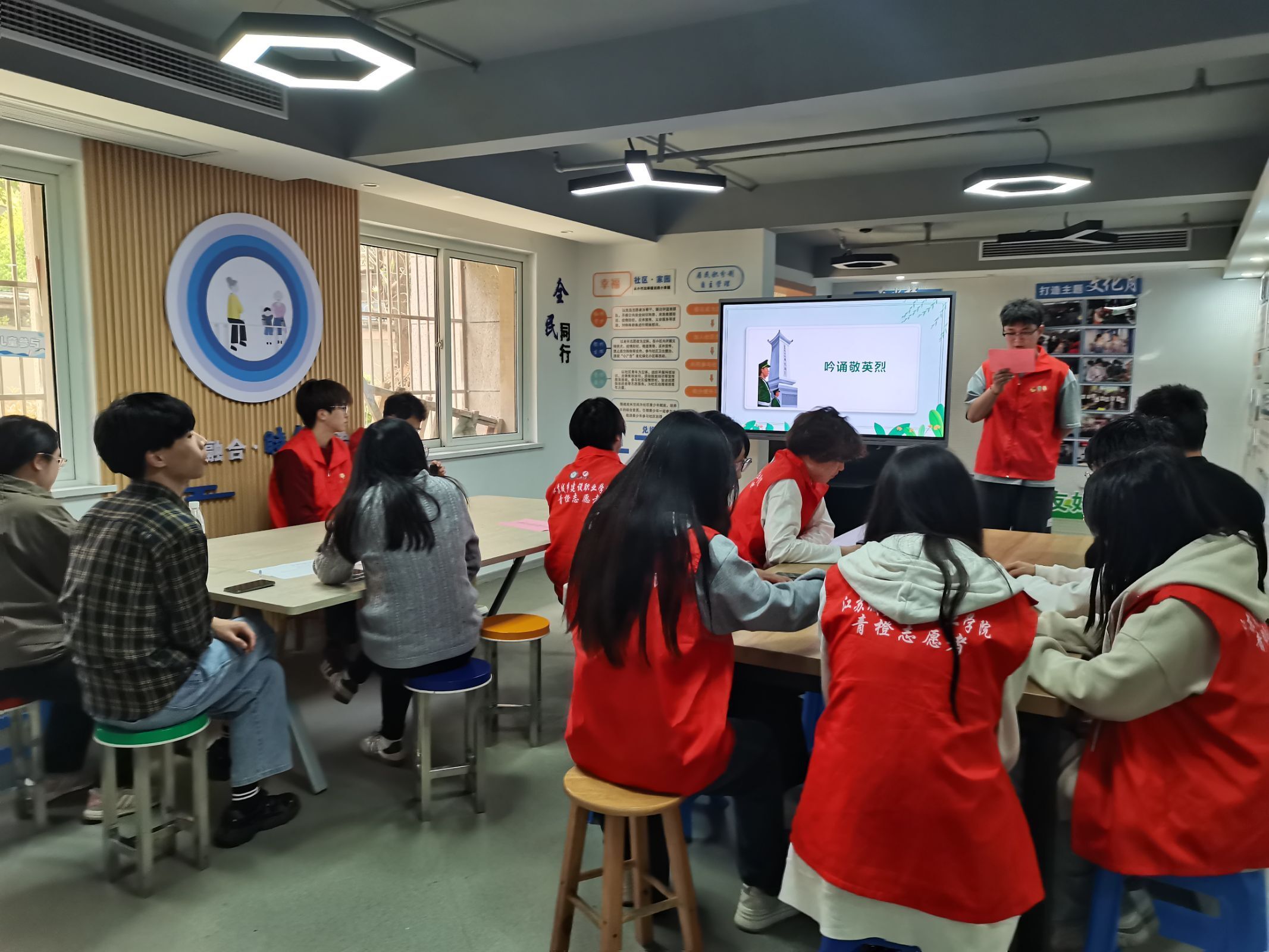 “雄关漫道真如铁,而今迈步从头越。从头越,苍山如海,残阳如血。”铿锵有力的朗读,拉开了活动的序幕。社区邀请江苏城乡建设职业学院的青年团员们为大家带来精彩的诗词朗诵。《梅岭三章》《滨江抒怀》等红色经典诗词轮番登场,青年们用纯粹的嗓音去朗诵,从内心表达了爱党、爱国的真挚情感。
