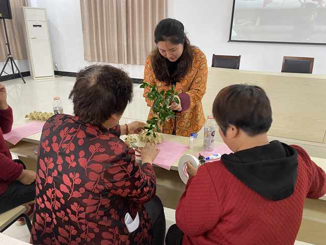 活动现场,社区工作人员准备了许多包装鸡蛋的托盘放置在桌面上,陆老师向老年居民们详细讲解了活动的制作流程:剪裁、修剪、固定、最后的装饰。随后,陆老师引导老人们一起动手......一板板鸡蛋托盘就变成了一朵朵形状各异的花儿,经过固定、装饰,最后摇身一变,成了一枝枝漂亮的花束,让老年居民们切身感受到“变废为宝”的妙处。