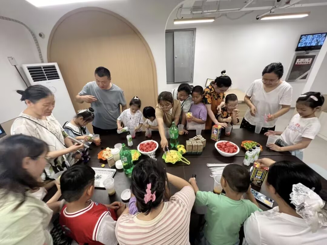 活动以热身小游戏“你比我猜”为切入点,开启大家对夏天的探索欲。翻开绘本《夏天是什么样的》,志愿者老师带领孩子们穿梭于蝉鸣、果香与清风交织的夏日画卷,在探索季节奥秘的同时,开启一场阅读与创意的奇妙之旅。活动中,孩子们跟随老师的脚步,在趣味阅读中解锁自然知识,也通过水果茶DIY制作,将书中的夏日印象转化为“果”滋味。活动以“读”启智、以“做”促学,让孩子们在沉浸式体验中,收获知识、激发想象。