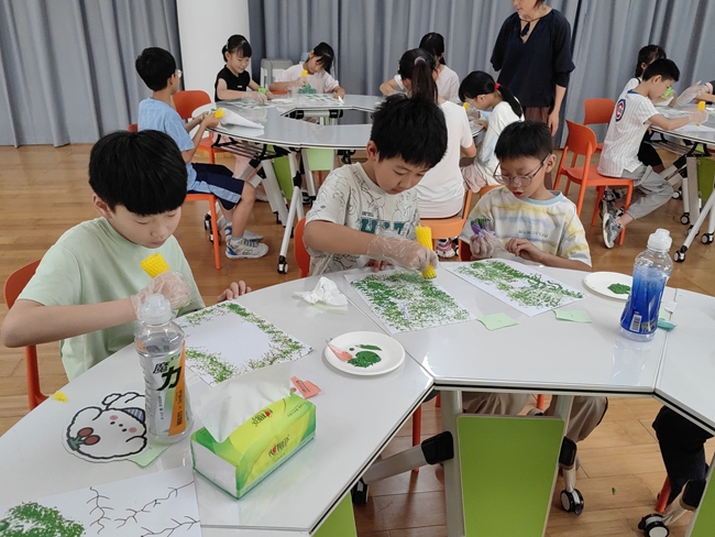 活动伊始,课程以一幅色彩明快的画为切入点,引领小朋友们发挥想象力进行创作。孩子们在凌晓琴老师的带领下,借助普通的“生活垃圾”,完成了一幅幅美丽的画作。
