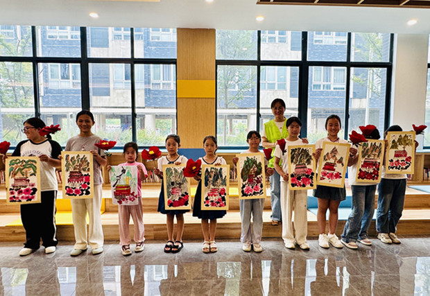 最后进行的“天安门牡丹”国画共创将气氛推向高潮。孩子们在志愿者指导下,以国庆与中秋为主题共同创作,绘出充满爱国情怀与童真想象的作品。
