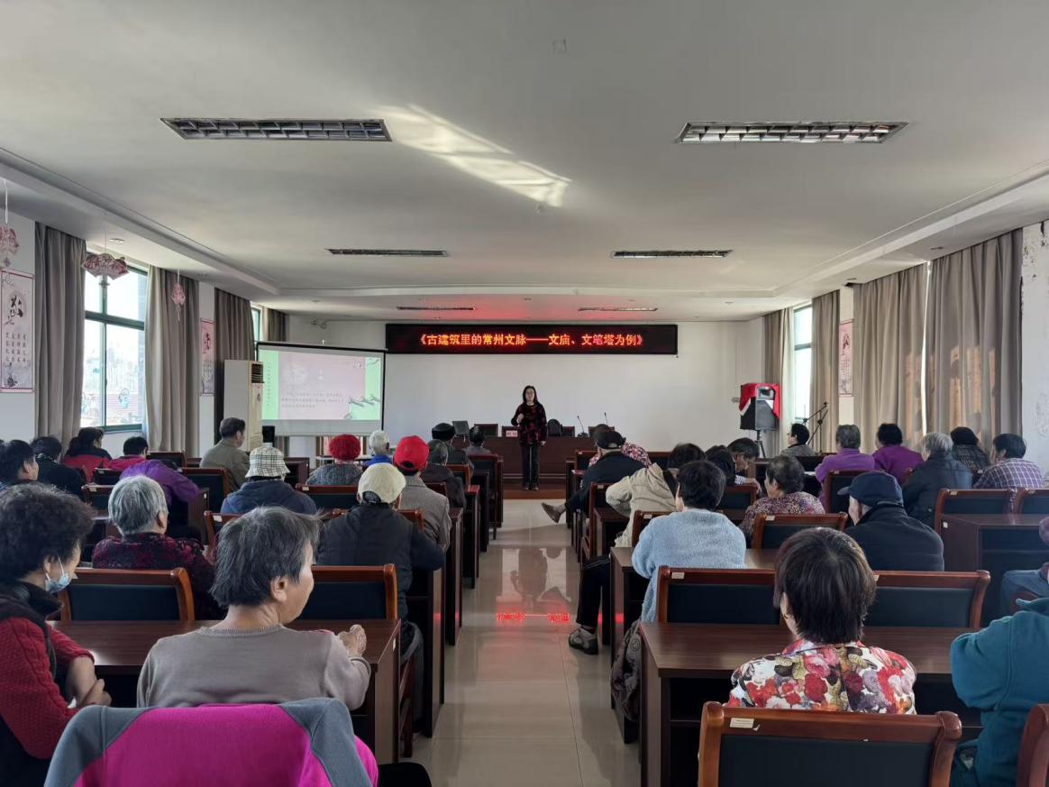 课堂上,胡婕老师以常州文庙和文笔塔两座标志性古建筑为核心,展开生动细致的讲解。从常州文庙的始建渊源、历代修缮历程,到其作为儒家文化传承载体的历史价值,再到大成殿的屋顶结构、雕花工艺等建筑形制特点,胡老师结合史料图片,用通俗易懂的语言娓娓道来。谈及文笔塔,她着重介绍了“文笔夕照”的历史典故,解析了塔体八角七层的形制寓意,以及其在常州科举文化中的象征意义,让老人们深刻感受到古建筑背后深厚的文化底蕴。
