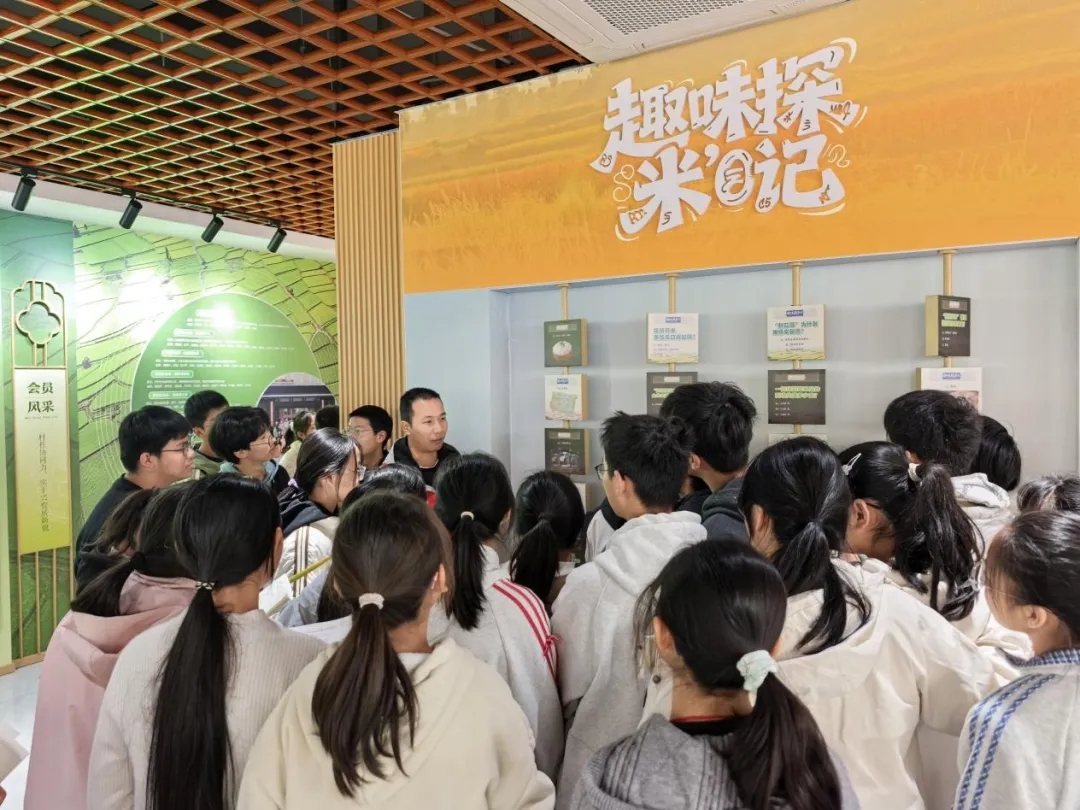 学生们走进指前标米展示中心及钱国平农机社。在这里,他们通过阅读图文资料、观看品牌档案,系统了解了“指前标米”的发展历程与品质标准,亲眼见到水稻烘干、脱壳、精米加工的全过程,让“一粒米的旅程”变得真实可感。负责人讲解的每个细节都化作对现代农业的生动诠释,孩子们眼中写满惊叹。随后,大家走进金黄的稻田,亲手体验收割稻谷。弯下腰,拿起镰刀,当汗水滴入泥土,抽象的诗句瞬间拥有了具体的重量。带着劳动的体验,方才的田间劳作与眼前的产业成果相互印证,此前在实践中积累的感性认识,迅速升华为对本土农业品牌化、产业化的理性认知,深深激发了对家乡科技兴农的自豪感。