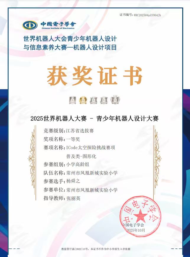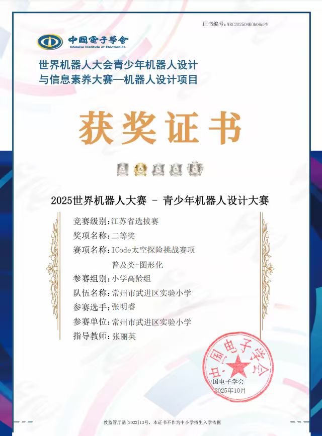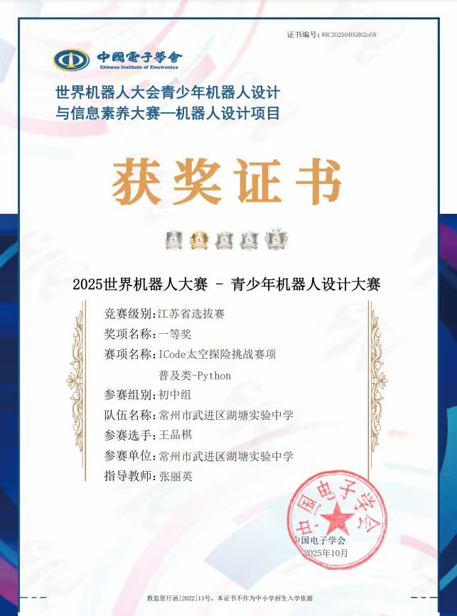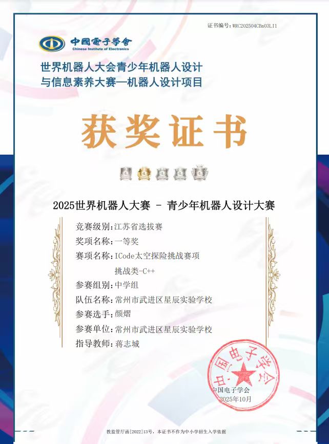 在刚刚落幕的2025世界机器人大赛江苏省选拔赛(ICode太空探险挑战赛)中,人工智能特色项目工作室学员表现突出,斩获优异成绩,共有9名同学参赛,其中有5名同学荣获省一等奖,4人获省二等奖,获奖率和一等奖获奖率均居常州第一。