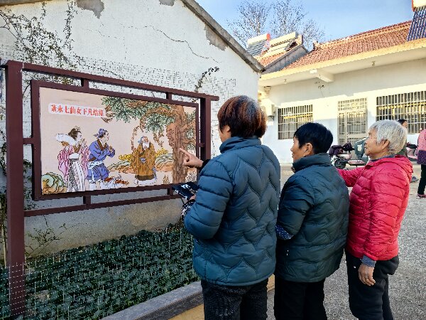 没几步远的宣传栏前几个阿姨围着那幅 “董永七仙女下凡结缘” 的彩绘,李阿姨指着画里的老槐树拍腿:“就是咱这棵树!当年董永卖身为奴,就是在这儿遇上的七仙女!” 旁边的王奶奶也凑过来:“我记得老故事里说,这树还开口当媒人了呢!”