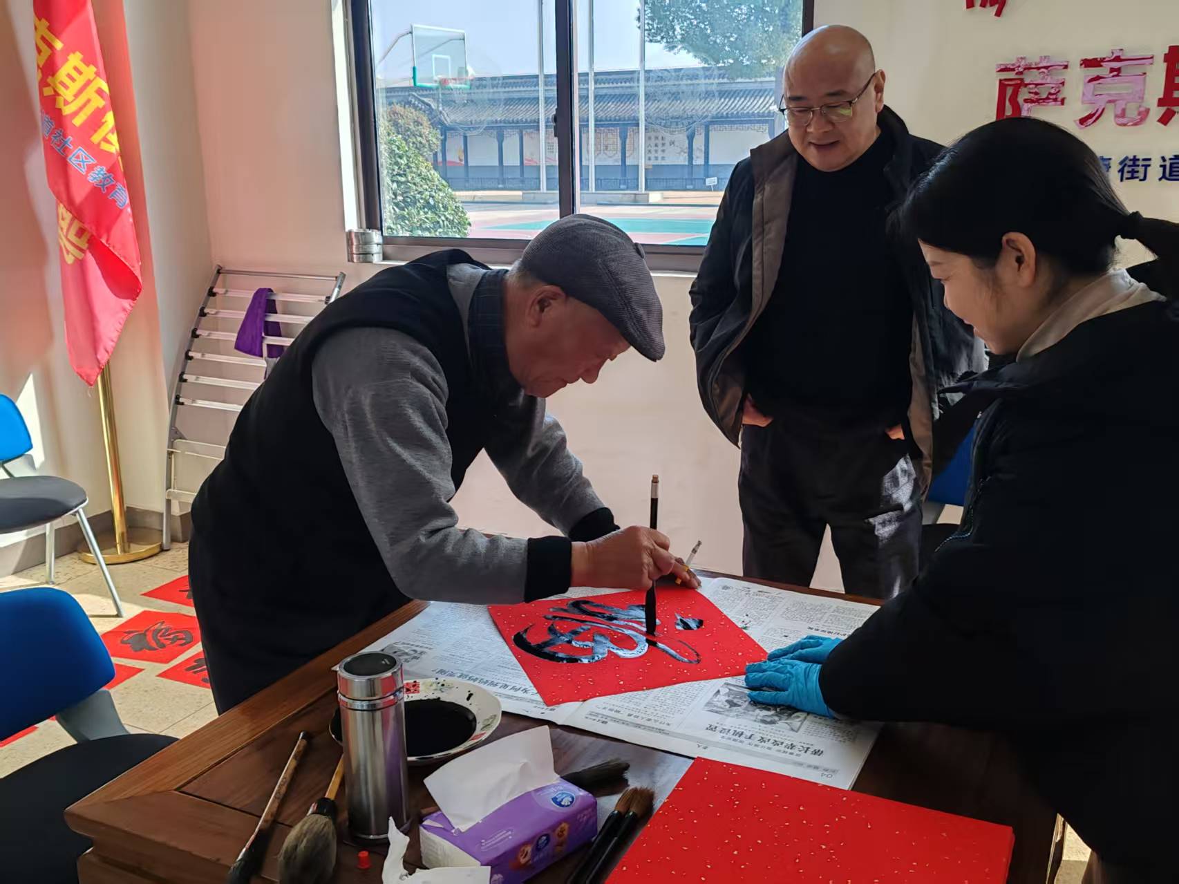 活动尚未正式开始,水北社区文化站早已排起长队。“义写春联送祝福”摊位前,四位来自常州聋人协会的书法家挥毫泼墨。红色的宣纸铺展开来,黑色的墨迹蜿蜒游走,一幅幅充满年味的对联在笔尖诞生。王大爷捧着刚刚写好的“福”字,眯着眼睛端详:“这字有筋骨,比印刷的强多了!”